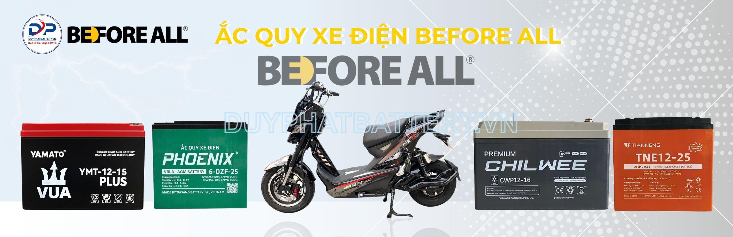 Nếu bạn đang tìm kiếm ắc quy xe điện Before All có hiệu suất cao và đáng tin cậy cho chiếc xe điện của mình, bạn đã đến đúng nơi. Với đa dạng các loại ắc quy xe điện Before All để bạn lựa chọn, Ắc quy Duy Phát sẽ hỗ trợ bạn. Nhiều thương hiệu ắc quy xe điện nổi tiếng hiện nay như: PHOENIX, TIANNENG, YAMATO, XUPAI, PINACO, CHILWEE,... dùng cho các dòng xe điện Before All của chúng tôi được hỗ trợ giao hàng nhanh chóng, lắp đặt tận nơi miễn phí, bảo hành 9 tháng và đảm bảo hài lòng trong 60 ngày.