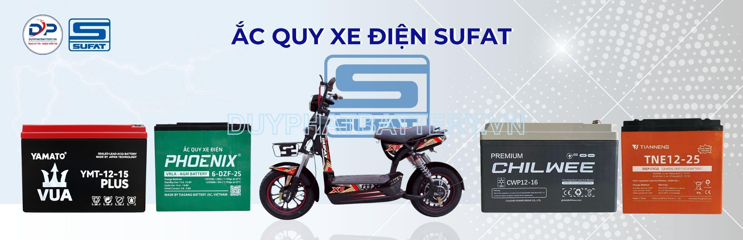 Nếu bạn đang tìm kiếm ắc quy xe điện Sufat có hiệu suất cao và đáng tin cậy cho chiếc xe điện của mình, bạn đã đến đúng nơi. Với đa dạng các loại ắc quy xe điện Sufat để bạn lựa chọn, Ắc quy Duy Phát sẽ hỗ trợ bạn. Nhiều thương hiệu ắc quy xe điện nổi tiếng hiện nay như: PHOENIX, TIANNENG, YAMATO, XUPAI, PINACO, CHILWEE,... dùng cho các dòng xe điện Sufat của chúng tôi được hỗ trợ giao hàng nhanh chóng, lắp đặt tận nơi miễn phí, bảo hành 9 tháng và đảm bảo hài lòng trong 60 ngày.