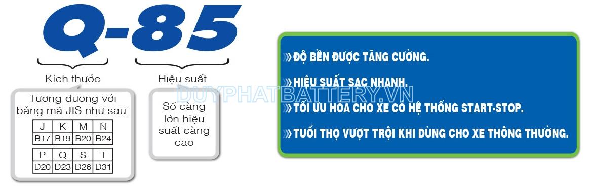 Bình ắc quy GS Q85 (12V-65Ah) thuộc phân khúc ẮC QUY GS START STOP - đây là dòng ắc quy sử dụng công nghệ EFB (Enhanced Flooded Battery) được phát triển từ ẮC QUY GS MIỄN BẢO DƯỠNG thông qua việc bổ sung các chất phụ gia carbon trong quá trình sản xuất tấm lắc ắc quy với các tính năng bổ sụng: Cung cấp số lần khởi động nhiều hơn, chấp nhận việc sạc lại nhiều lần và cung cấp gấp đôi hiệu suất xả sâu và có độ bền chu kỳ cao hơn khi hoạt động ở trạng thái dừng động cơ, đáp ứng được điều kiện sử dụng khắc nghiệt của xe có công nghệ Start Stop. Bình ắc quy GS Q85 (12V-65Ah) nhận được nhiều tin tưởng, thiện cảm nhận diện thương hiệu tốt từ người tiêu dùng Việt Nam khi lựa chọn bình ắc quy khởi động dùng cho xe Start Stop với nhiều ưu điểm nổi bật: