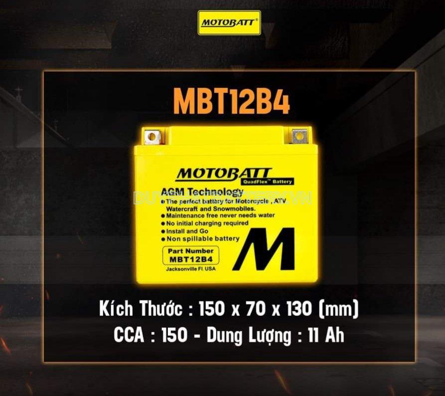 Bình ắc quy MOTOBATT MBT12B4 (12V-11Ah) được thừa hưởng các công nghệ tiên tiến, cùng quy trình kiểm soát chất lượng nghiêm ngặt theo tiêu chuẩn từ Hoa Kỳ. Bởi vậy bình ắc quy MOTOBATT MBT12B4 được coi như giải pháp hàng đầu về bình ắc quy thay thế cho các dòng xe mô tô phân khối lớn tại Việt Nam bởi những yêu cầu cao về: "Công suất khởi động, hiệu suất sử dụng, độ tin cậy đã được kiểm chứng".
