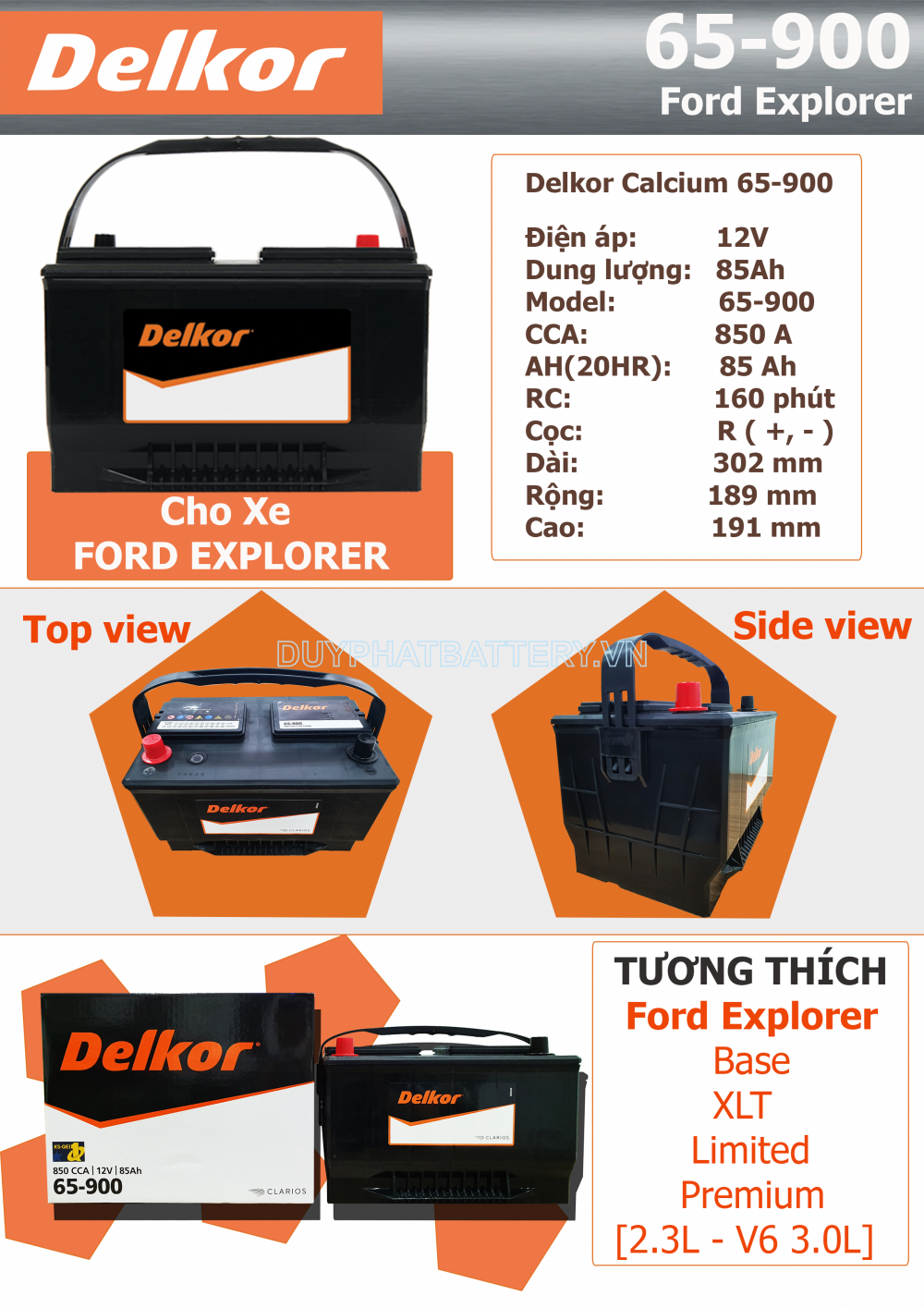 - Ford Explorer sử dụng bình ắc quy DELKOR 65-900 (12V-85Ah)